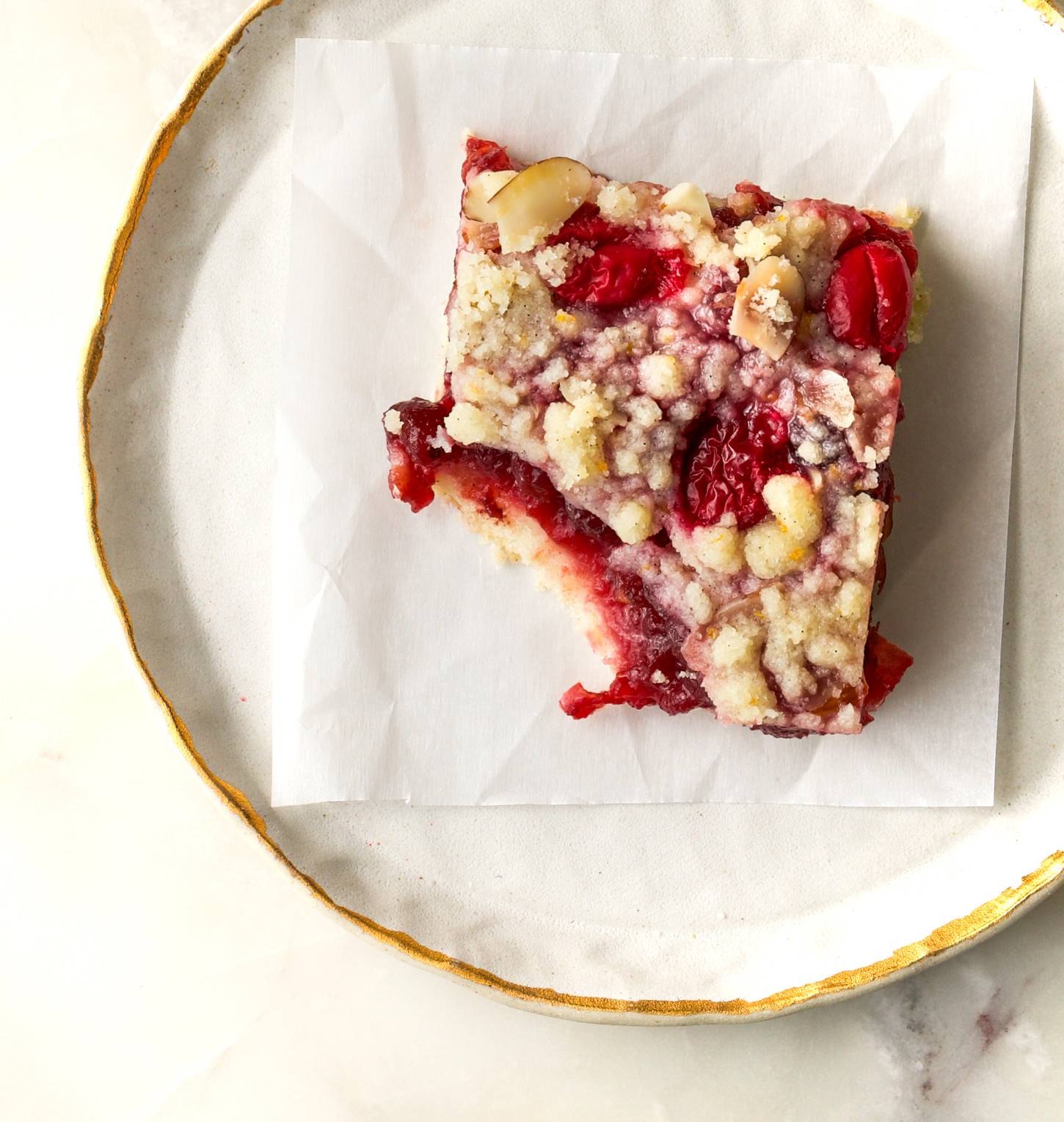 β Hi Reader! An easy breezy shortbread crust is covered in cranberry jam (so simple, takes about 30 minutes) and then topped with my favorite blonde streusel that's jazzed up with orange zest, vanilla bean and sliced almonds. I'm not sure you can find a holiday cookie that screams holiday louder than this one! All three components of this recipe (the crust, jam and streusel) can be made ahead of time and stored separately in the fridge for several days. Assemble and bake the day you want to serve. These bars can go casual, or you can jazz them up further with a scoop of vanilla ice cream. This is not a cookie that ships well for those sending out cookie boxes. As usual, leave any comments on the blog, and I will respond asap! Happy Wednesday! β₯οΈ