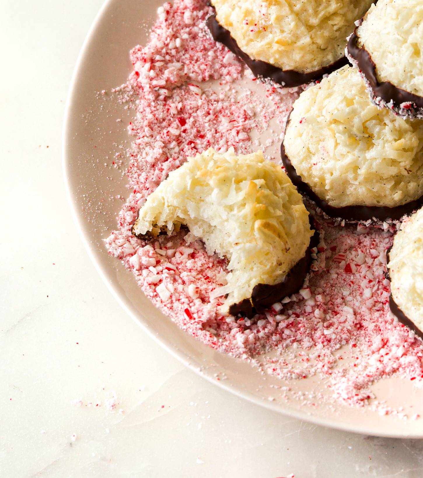 Hi Reader! A fun twist on classic macaroons! This foolproof recipe whips up the most perfect coconut macaroons. We then dip them in rich, dark chocolate (to balance the sweetness!) and finish with a festive coating of finely crushed candy canes. The best part? The coconut macaroon base can be mixed and baked in under 45 minutes. They take no time at all. I've included a heap of expert tips for making perfect meringue (one of my favorite things to do!) and for melting chocolate so you get...