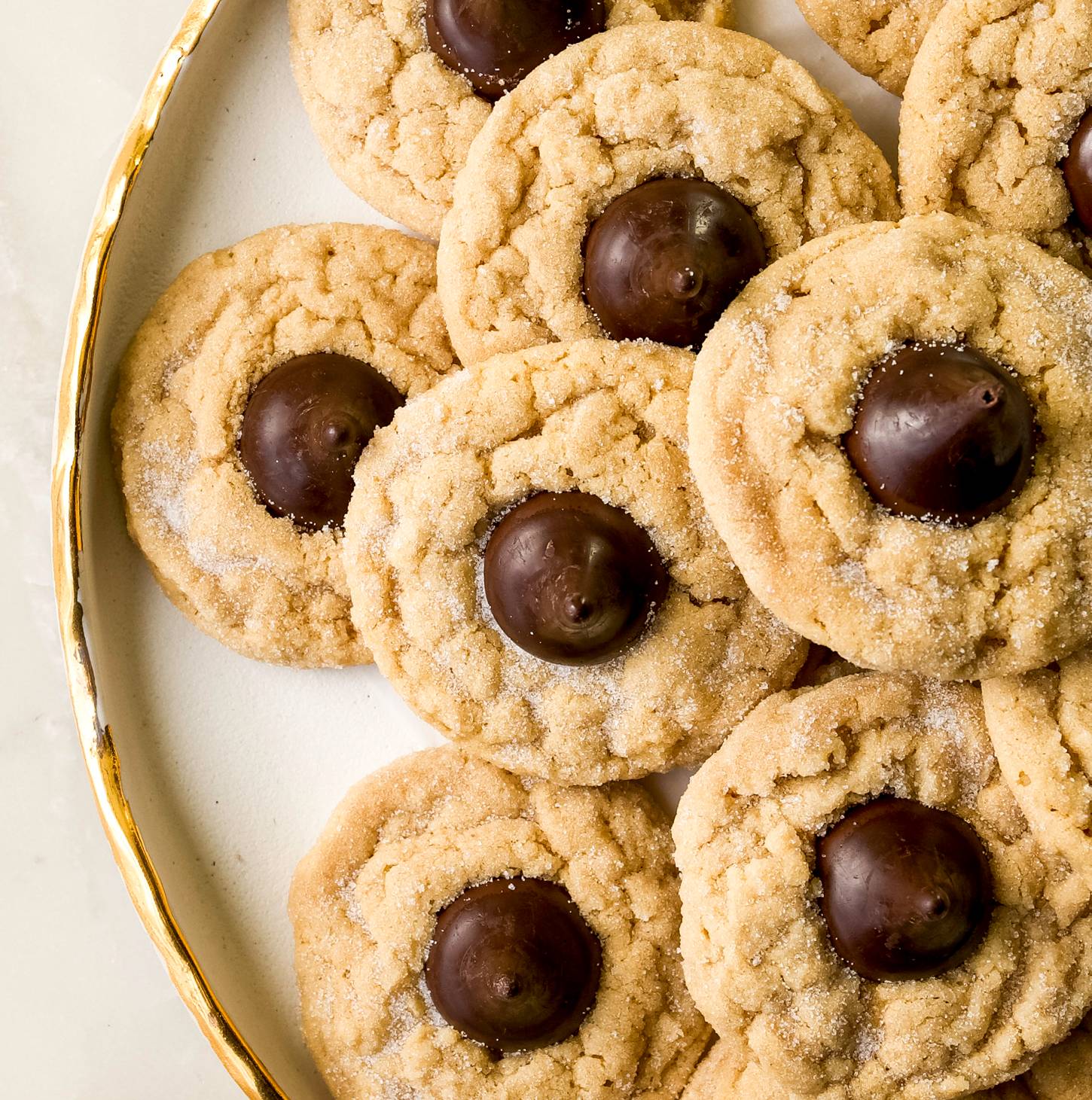 Hi Reader! This peanut butter cookie has a perfect soft, chewy texture that's loaded with flavors of vanilla, dark brown sugar and creamy peanut butter. They're perfect. I love them topped with dark chocolate kisses, but feel free to use milk chocolate. Whichever strikes your fancy. This one-bowl recipe is super quick and easy to throw together and takes just 10 minutes (!!). You can bake them straight away, but the real magic in this cookie dough comes when you give it an overnight...