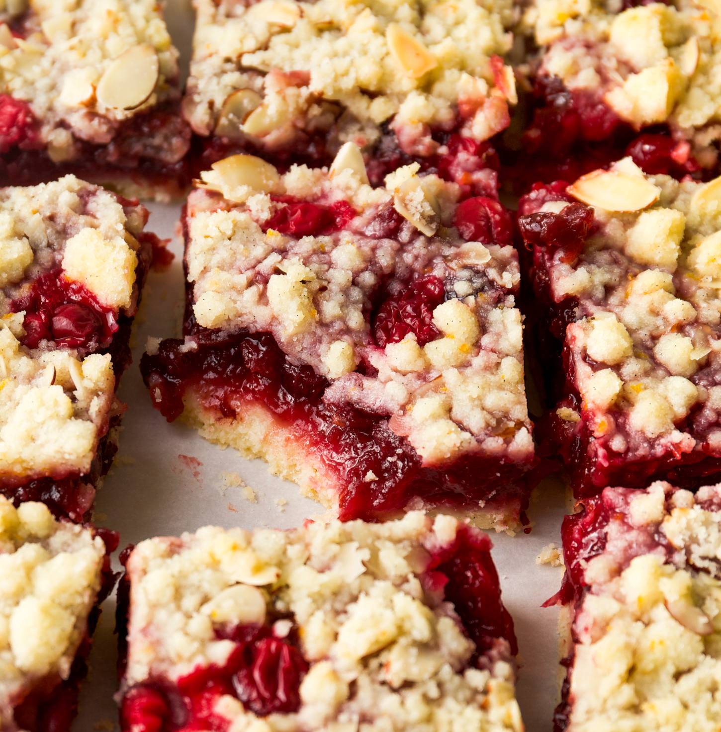 Hi Reader! An easy breezy shortbread crust is covered in cranberry jam (so simple, takes about 30 minutes) and then topped with my favorite blonde streusel that's jazzed up with orange zest, vanilla bean and sliced almonds. I'm not sure you can find a holiday cookie that screams holiday louder than this one! All three components of this recipe (the crust, jam and streusel) can be made ahead of time and stored separately in the fridge for several days. Assemble and bake the day you want to...