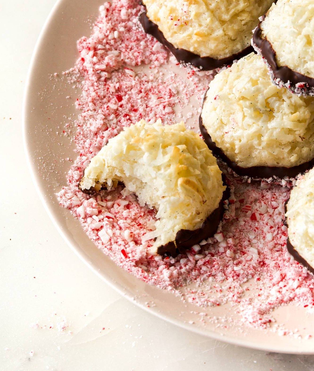 Hi Reader! A fun twist on classic macaroons! This foolproof recipe whips up the most perfect coconut macaroons. We then dip them in rich, dark chocolate (to balance the sweetness!) and finish with a festive coating of finely crushed candy canes. The best part? The coconut macaroon base can be mixed and baked in under 45 minutes. They take no time at all. I've included a heap of expert tips for making perfect meringue (one of my favorite things to do!) and for melting chocolate so you get...
