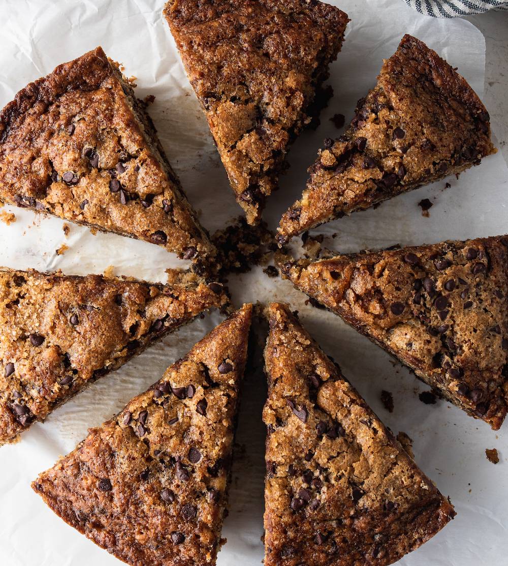 A super delicious, banana-forward, easy peasy banana cake recipe! A one-bowl wonder that draws on browned butter, heaps of vanilla and a touch of nutmeg for the most delicious banana cake out there. Baked up in a skillet and sprinkled with dark chocolate and Demerara sugar (optional), it's like a fancier, casual-chic version of banana bread!